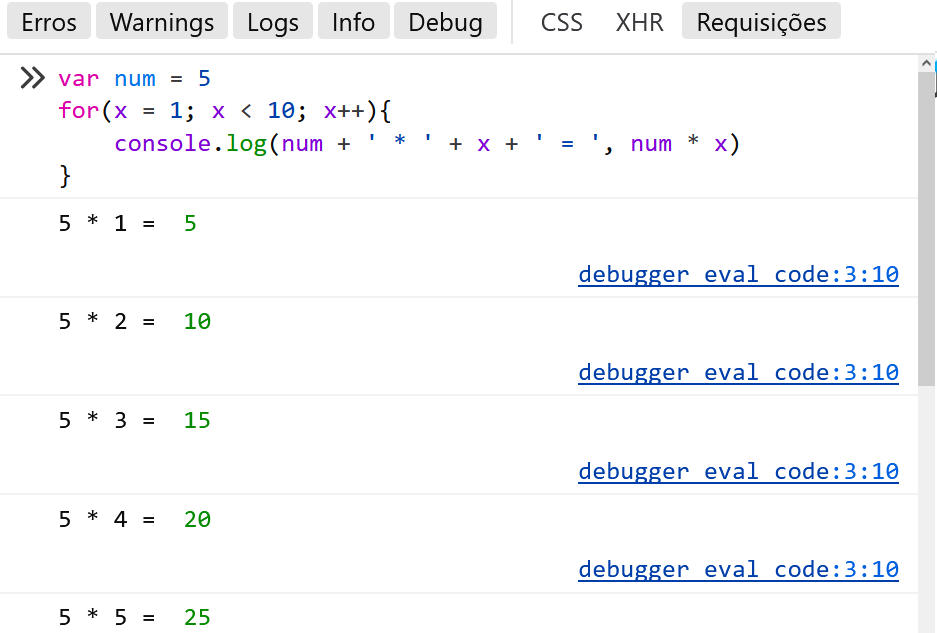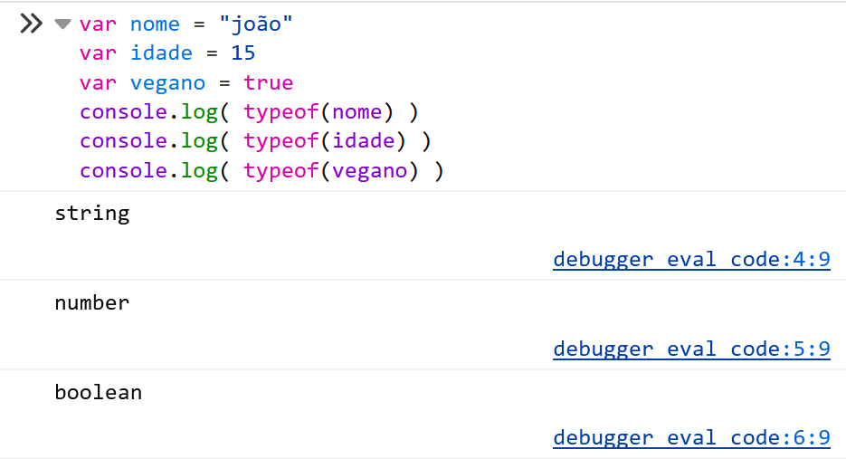 Conseguimos criar variáveis com o comando VAR e imprimir valores no console com o comando CONSOLE.LOG: