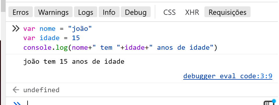 - Ainda no console do navegador, crie um código que imprima seu nome e sua idade com o comando console.log ( ).