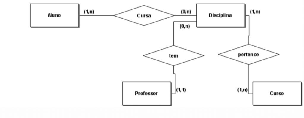 1. Identifique os atributos das entidades: aluno, disciplina, curso e professor, com base no diagrama abaixo: