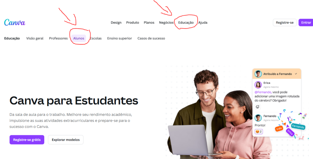 Link para o Canva Education: https://www.canva.com/pt_br/educacao/estudantes