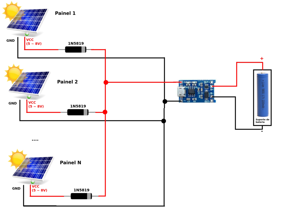 → Acionamento de luzes automáticas em galpões à noite. - Módulo Solar + Bateria: