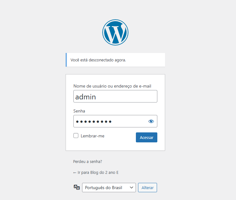 Nessa tela digite o usuário “admin” e a senha peça ao professor ou pergunte a um colega. Após digitar as credenciais de acesso, clique em acessar.