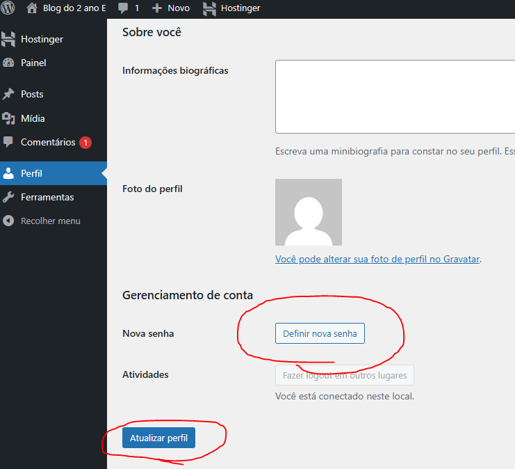 E na parte inferior da página, redefina a senha e clique no botão “Atualizar Perfil”