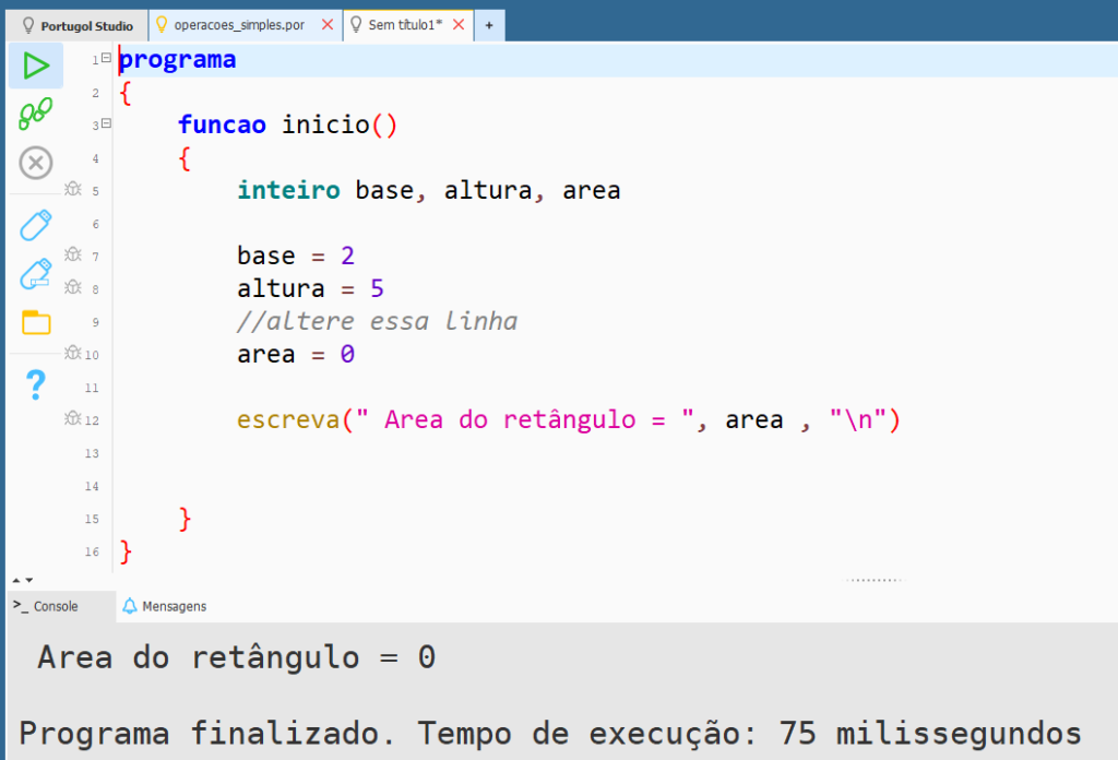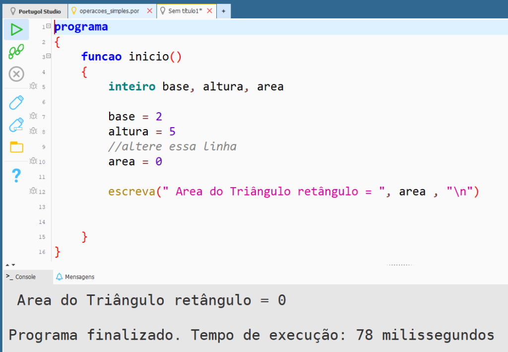 AREA = (BASE x ALTURA) / 2“. Altere o código abaixo para calcular a área de um triângulo retângulo. Execute o código para verificar o resultado.