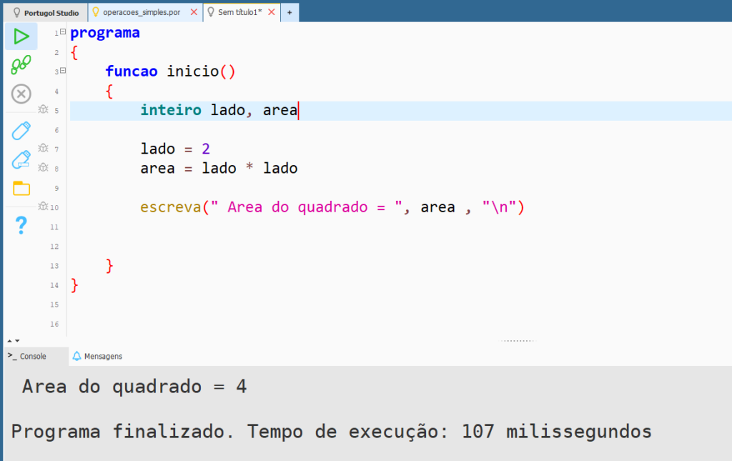 • Questão 03: Podemos calcular a área de um quadrado com a fórmula “LADO x LADO“. Altere o código abaixo para calcular a área de um quadrado com o lado de tamanho 5. Execute o código para verificar o resultado.
