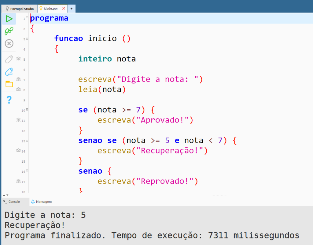 • Se a nota for maior ou igual a 5 e menor que 7, deverá imprimir a mensagem “Recuperação!”